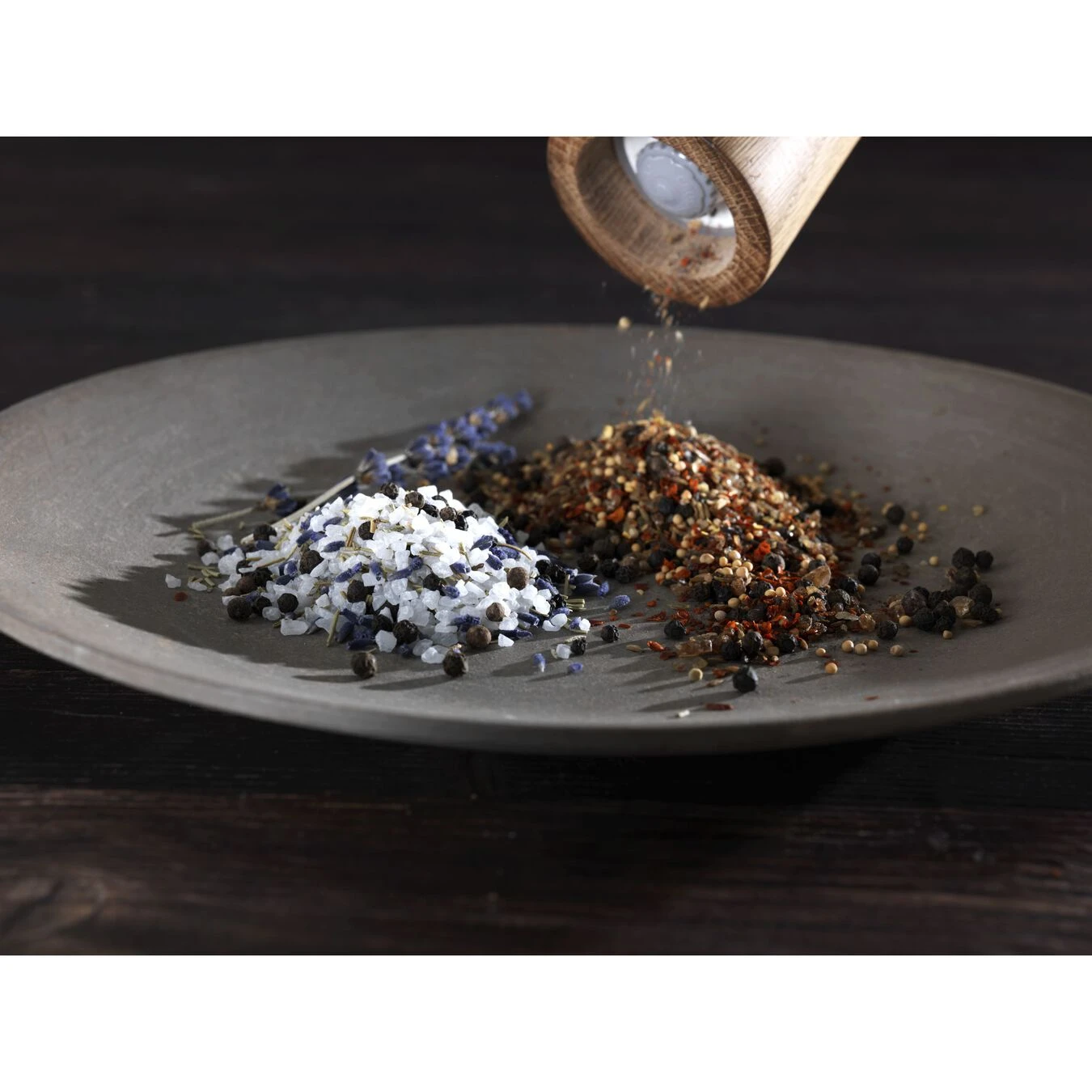 Dank der hochwertigen Holzmühle erhältst du frisch gemahlenen Pfeffer, mit dem kulinarische Kreationen eine ganz besondere Würze bekommen – ob süßer Urwaldpfeffer, fruchtiger Kampot-Pfeffer oder zitroniger Kubeben-Pfeffer. Um die wertvollen, exotischen Gewürze ideal zu zermahlen, ist die Holzmühle aus der Serie ZWILLING Spices von ZWILLING das geeignete Küchenwerkzeug. Die konische Pfeffermühle verbindet Natürlichkeit und Tradition mit ausgeklügelter Technik und langlebigen, innovativen Materialien. Helles, leicht gemasertes Eichenholz verleiht der Pfeffermühle eine besonders rustikale Erscheinung und liegt beim Zermahlen von Gewürzen angenehm in der Hand. Ein hochwertiges Mahlwerk aus Keramik sorgt für eine hohe Langlebigkeit, da der natürliche Werkstoff korrosionsbeständig ist und auch bei häufigem Gebrauch leistungsstark und gleichmäßig mahlt. Mit der Holzmühle von ZWILLING zermahlst du auch große Mengen von Pfeffer ohne Ermüdung, da die Kraftübertragung ins Mahlwerk besonders effektiv ist. Die schlichte, klare Erscheinung der Gewürzmühle macht sie zum Designobjekt, das schon beim Kochen Freude bereitet und auf jedem Esstisch einen Hauch edler Natürlichkeit verleiht. Mit der Pfeffermühle aus der Serie ZWILLING Spices kannst du neben Pfeffer auch Salz und andere Gewürze, wie geschroteten Kümmel, Piment oder ganze Senfkörner, frisch und fein mahlen.